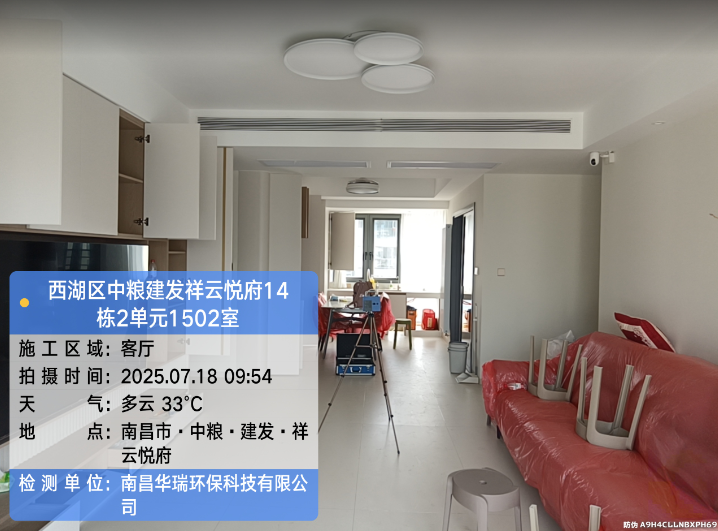 項(xiàng)目名稱:西湖區(qū)中糧建發(fā)祥云悅府14棟2單元1502室甲醛檢測施工日期:2025.7.18